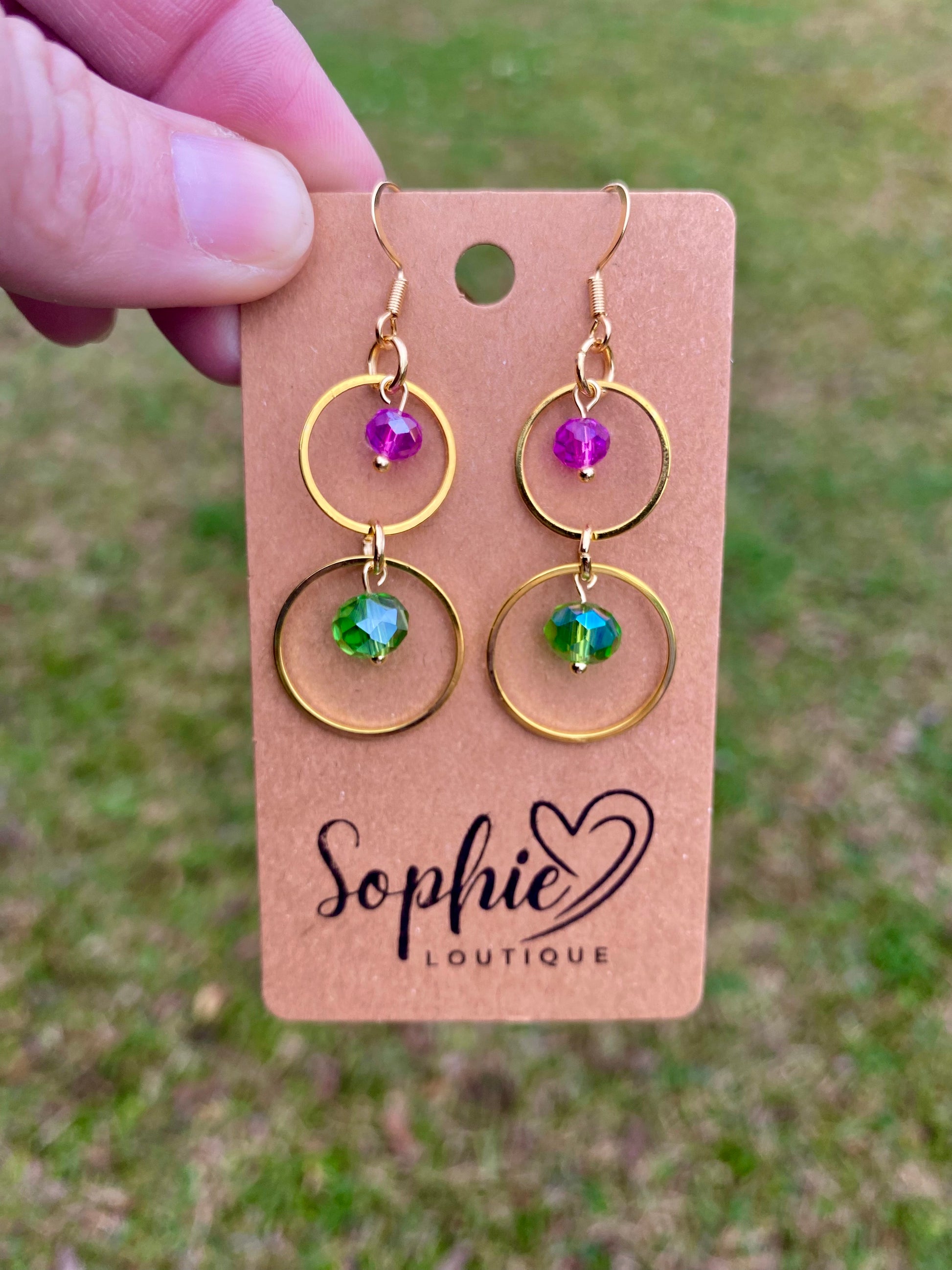 A stunning double hoop earring featuring purple and green faceted crystals. 14K gold-filled earring hooks.